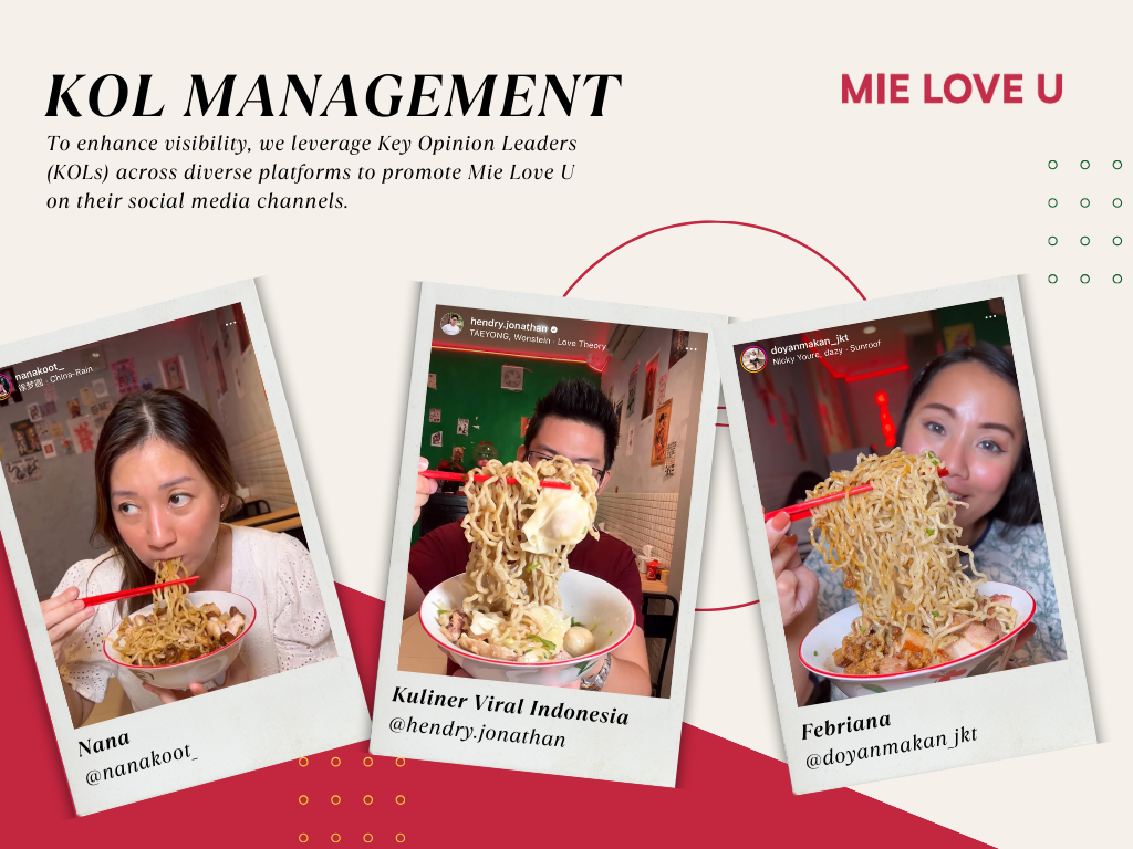 Through our strategic collaborations with distinguished Key Opinion Leaders (KOLs), mainly from the F&B and lifestyle field, we have effectively conveyed Mie Love U’s main messages and significantly enhanced brand recognition. This journey from the careful selection of KOLs to the supervision of their content uploads has been designed to ensure an impactful KOL engagement for Mie Love U.
